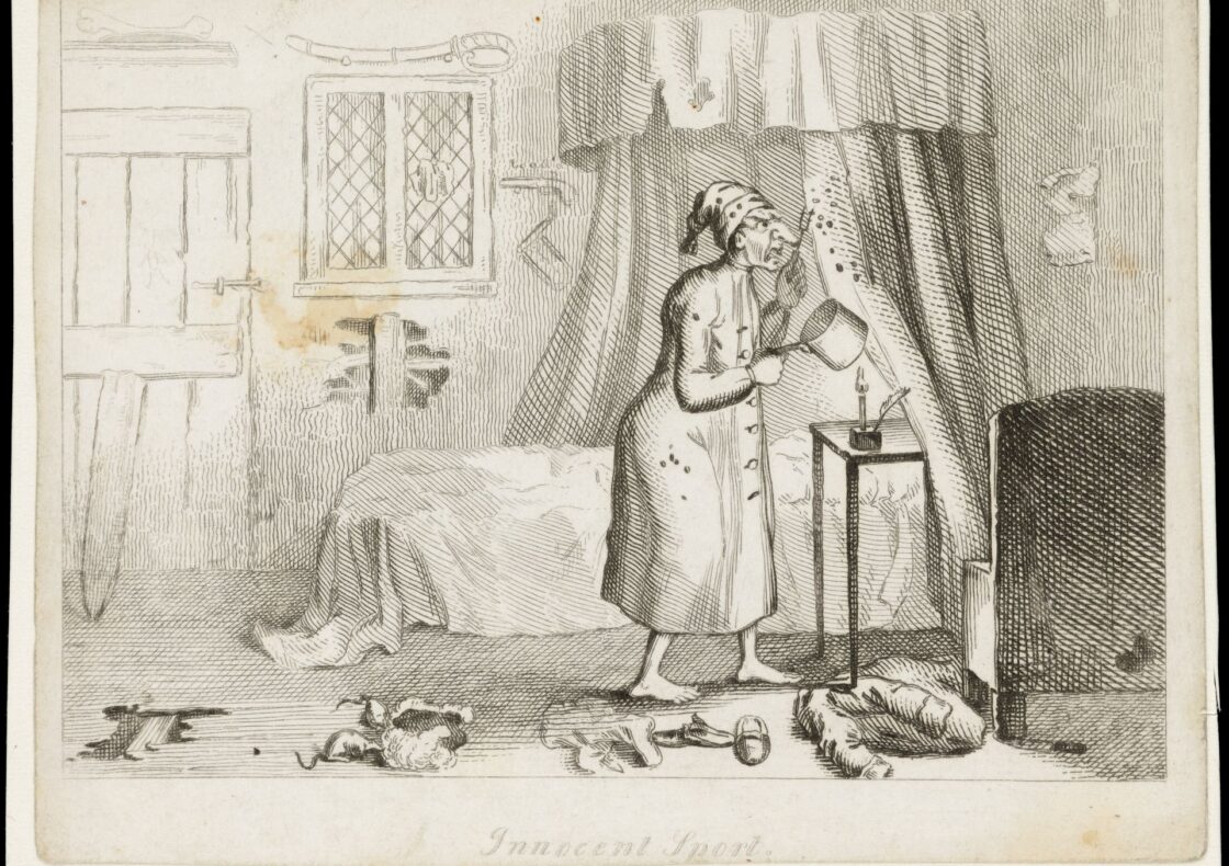 A man in bedclothes prising insects off his bed-curtains with a fork into a saucepan. Etching by T.L. Busby, c. 1826. CC BY 4.0, Courtesy: Wellcome Collection